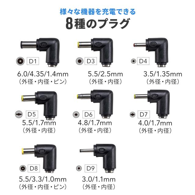 ■付属品:DC変換プラグ×8種類、DCケーブル(ケーブル長:約70cm)、ACアダプタ(ケーブル長:約1.5m)