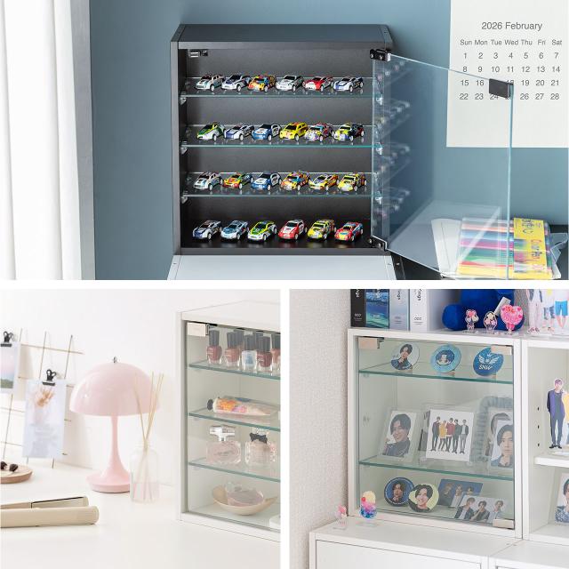 ⇒ご購入の前にご確認下さい推しグッズを魅せるも隠すも自由自在。組み合わせて増やせるキューブ型収納ボックスだから、アクスタや写真、周辺アイテムまで思い通りにレイアウト。あなたの推し空間が、もっと美しく、もっと好きになる。ガラス扉付き。4段式。ハーフサイズ。ブラック。【WEB限定商品】
