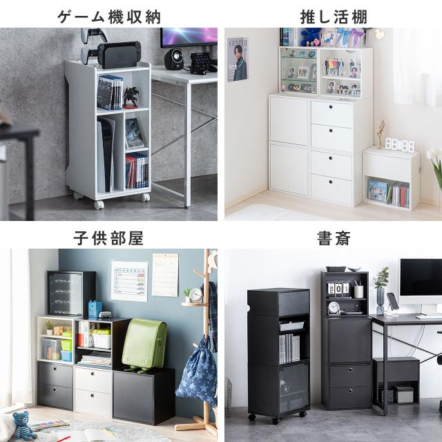 ⇒ご購入の前にご確認下さい推しグッズを魅せるも隠すも自由自在。組み合わせて増やせるキューブ型収納ボックスだから、アクスタや写真、周辺アイテムまで思い通りにレイアウト。あなたの推し空間が、もっと美しく、もっと好きになる。配線穴もあるので、ゲーム機やスマホを充電しながら収納できる。ガラス扉付き。2段式。ブラック。【WEB限定商品】