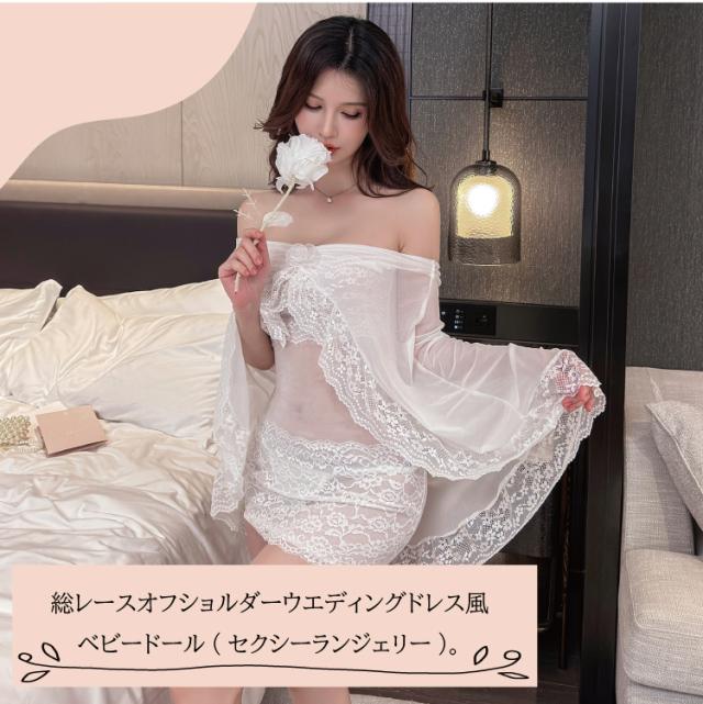 総レースオフショルダーウエディングドレス風ベビードール(セクシーランジェリー)。チュールのオフショルに花柄総レースが清楚でありながら、マイクロミニの丈感とレースアップのバックスタイルがセクシー。