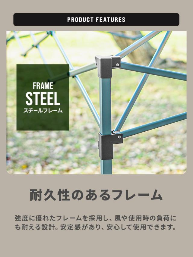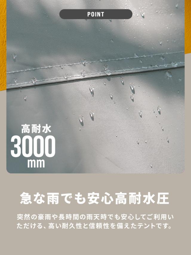 耐水圧3000mmで、急な雨が降っても安心の撥水加工が施されています。大人数のバーベキューやスポーツ観戦、アウトドア、休憩所にぴったり。