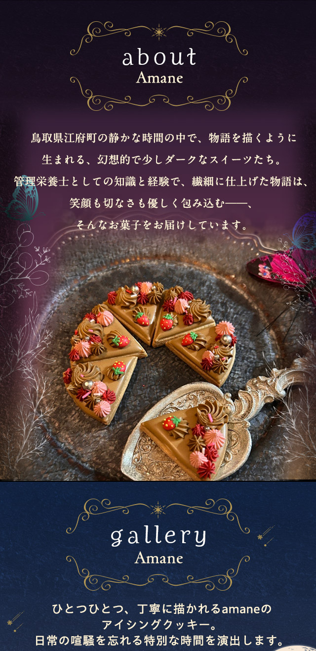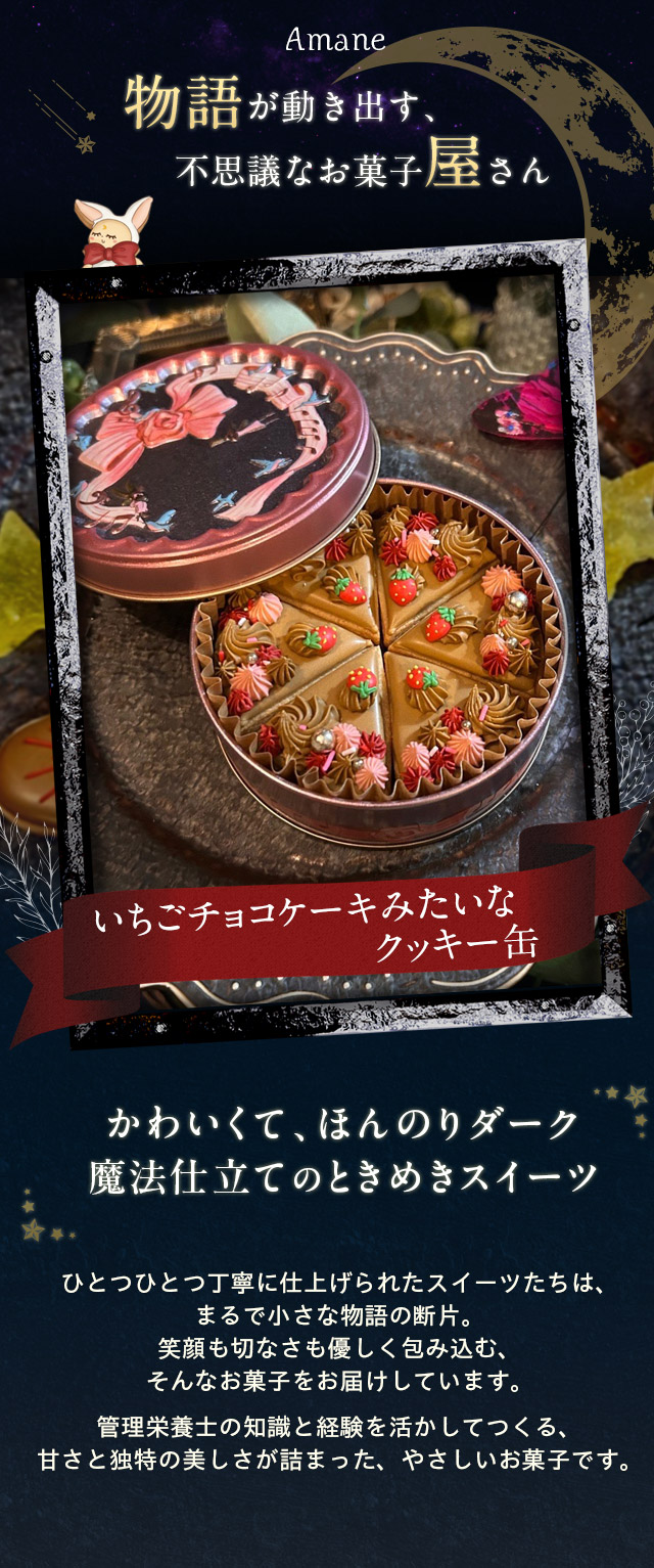 ひとつひとつ丁寧に仕上げられたスイーツたちは、まるで小さな物語の断片。笑顔も切なさも優しく包み込む、そんなお菓子をお届けしています。管理栄養士の知識と経験を活かしてつくる、甘さと独特の美しさが詰まった、やさしいお菓子です。
