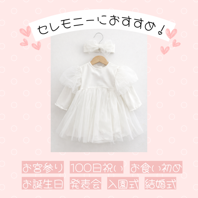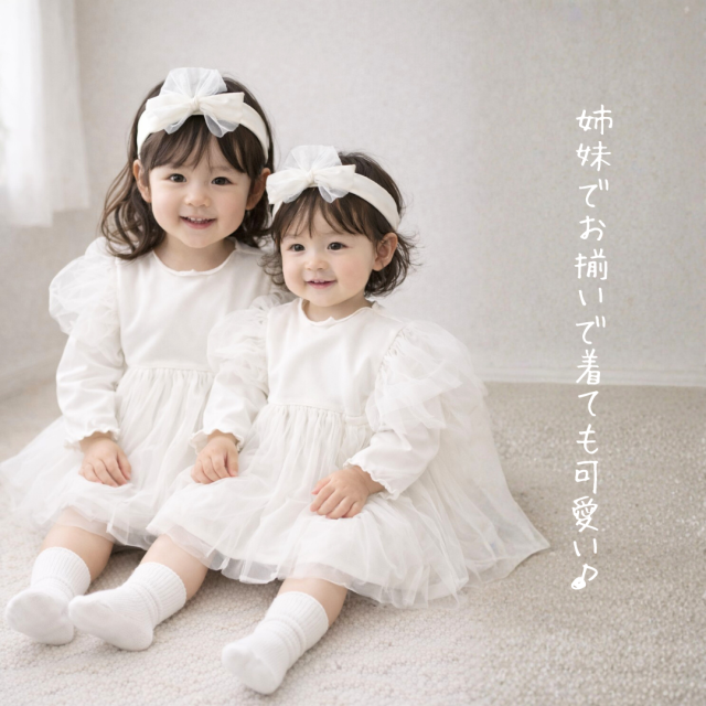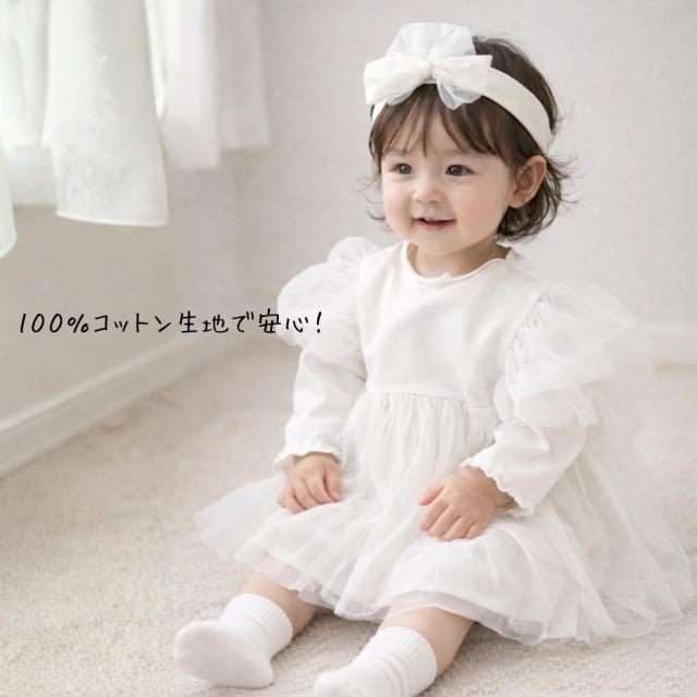 ベビー ドレス ヘアバンド付き ロンパース セレモニードレス 長袖 ワンピース 女の子 チュール スカート 赤ちゃん ベビー服 60 70 80 90 新生児 姉妹 お揃い ホワイト お祝い 春 秋 レース 出産祝い 撮影