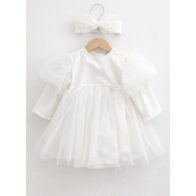 ふんわりチュールが魅力の「ヘアバンド付きベビードレス」です。