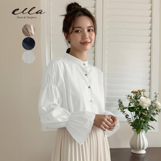 上品さとトレンド感を兼ね備えた、ギャザースリーブデザインのスタンドカラーシャツ。