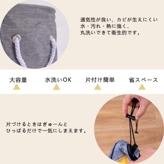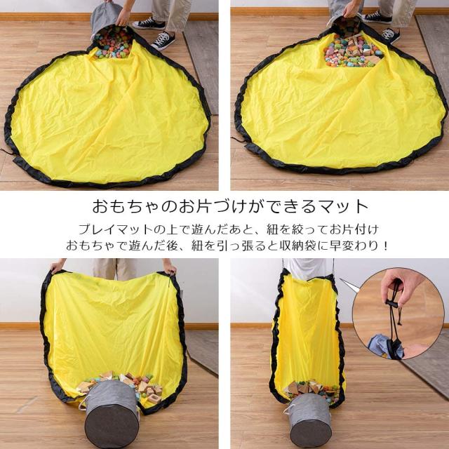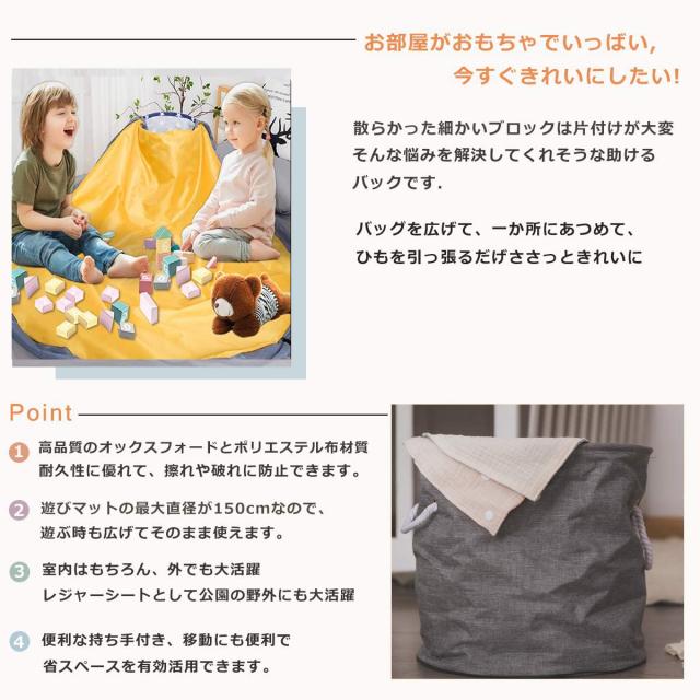【片付け簡単】シートのようになっている収納袋です。この上で遊べて、遊び終わったあと紐をキュッと絞めるだけでお片付け完了!おもちゃ箱よりとても簡単です。特におもちゃブロック等の細かいパーツのおもちゃの片付けが快適に。