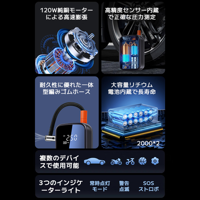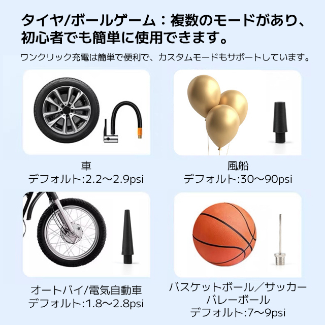 | 非常時照明機能&充電!五つのアダプター付きの電動空気入れ! | ◆付属の4つのアダプターを使えば、車、バイク、自転車のタイヤに簡単にエアを供給できます。さらに、ボールやプール用フロート、風船などの充填も可能です!また、非常時には懐中電灯としても大活躍!暗い場所での作業や緊急時の照明として安心してお使いいただけます。さらに、スマートフォンなどの電子機器に充電できる機能も搭載!アウトドアや旅行先での便利なサポートアイテムです。 |