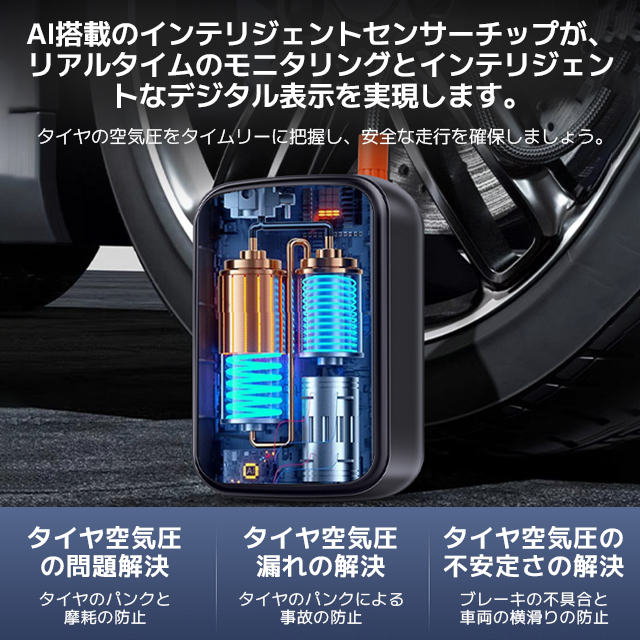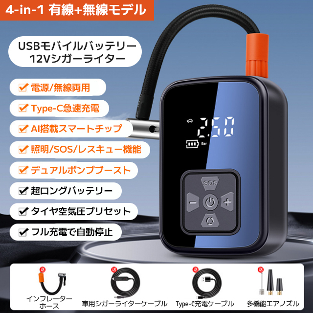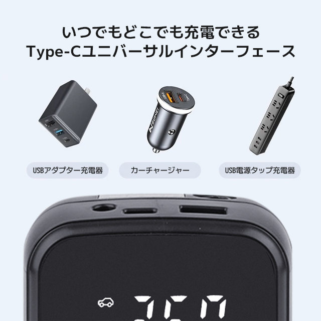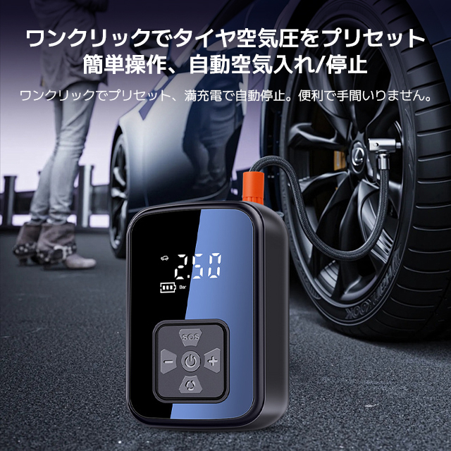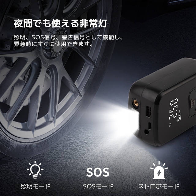 | ★便利さと機能性を両立!大画面ディスプレイ&LEDライト付き! | ◆見やすい大画面ディスプレイで、現在の空気圧を一目で確認!直感的な操作が可能で、設定も簡単。誰でも簡単に使える設計です。さらに、LEDライトを搭載しているので、夜間や暗い場所での作業もスムーズに行えます。タイヤの空気入れだけでなく、緊急時の照明としても役立ちます。 |