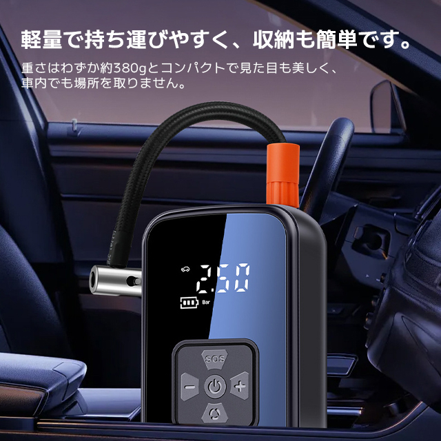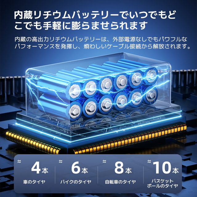 | コンパクト設計と大容量バッテリーで、どこでも使える! | ◆持ち運びに便利なコンパクト設計!車のトランクや自宅の収納にもスッキリ収まります。必要な時にサッと取り出せて、手軽に空気入れができます。製品本体のサイズは12.2×8.2×5.2cmで、一般的な製品の約3分の2の長さです。このコンパクトなデザインは、持ち運びや車内での収納に非常に便利です。さらに、4000mAhの大容量バッテリーを搭載しており、フル充電の状態でタイヤ3本分のエア供給が可能です。バッテリーの持続時間を心配する必要はありません。強力な大容量バッテリーで長時間の使用が可能!一度の充電で複数のタイヤや製品に対応できるので、安心してお出かけやスポーツを楽しめます。 |