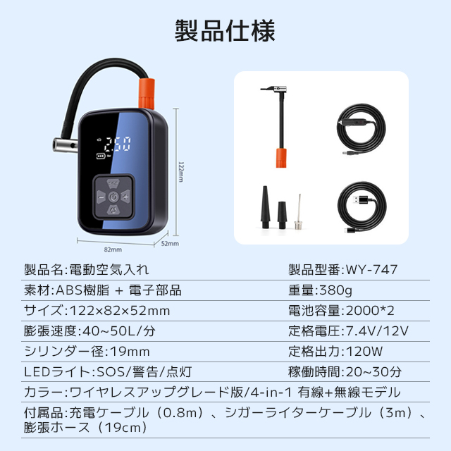 | 付属品 | ◆充電ケーブル(0.8m)、シガーライターケーブル(3m)、膨張ホース(19cm) |