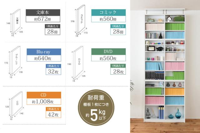 コミックやマンガ、DVDなどの収納できる枚数です。コンパクトなのにこの収納力は魅力的なポイントです。