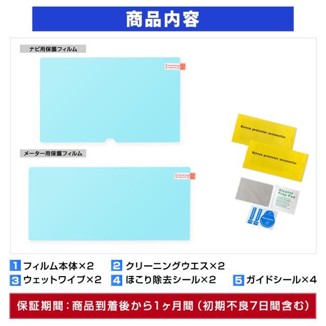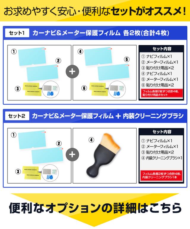 【単品】 [1]フィルム本体×2枚 [2]クリーニングウエス×2枚 [3]ウェットワイプ×2枚 [4]ほこり除去シール×2枚 [5]ガイドシール×4枚 【セット1:フィルム+内装クリーニングブラシ1本】 [1]ナビフィルム×2枚 [2]フィルム貼付け用品×2セット [3]内装クリーニングブラシ×1 |
