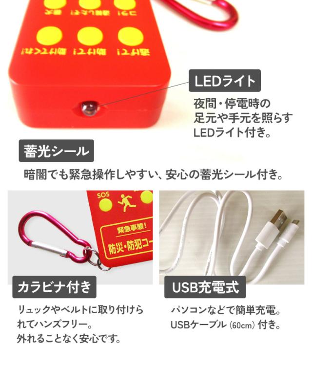 【メール便】防災・防犯コール 防犯ブザー 防災コール USB充電 カラビナ付き 緊急時 非常時 LEDライト 緊急ホーン 番犬 警告 非常警報 護身用 災害時 停電時 夜間 子ども 子供 大人 大音量 キッズ 高齢者 小学生 女性 充電式 アサノヤ