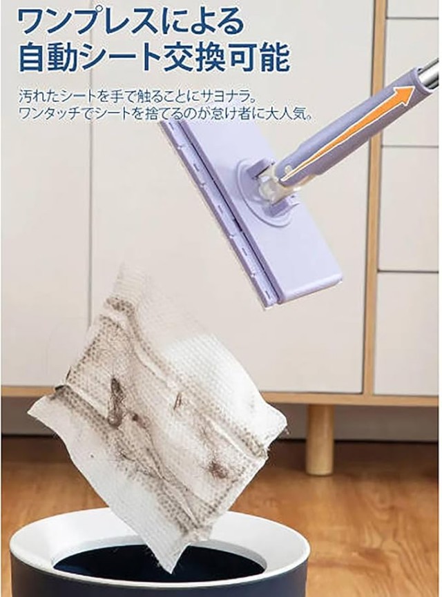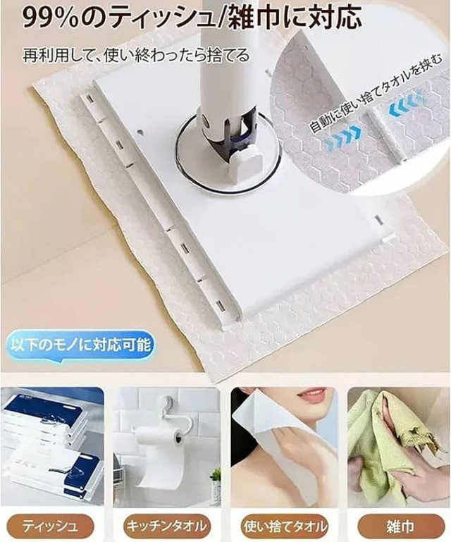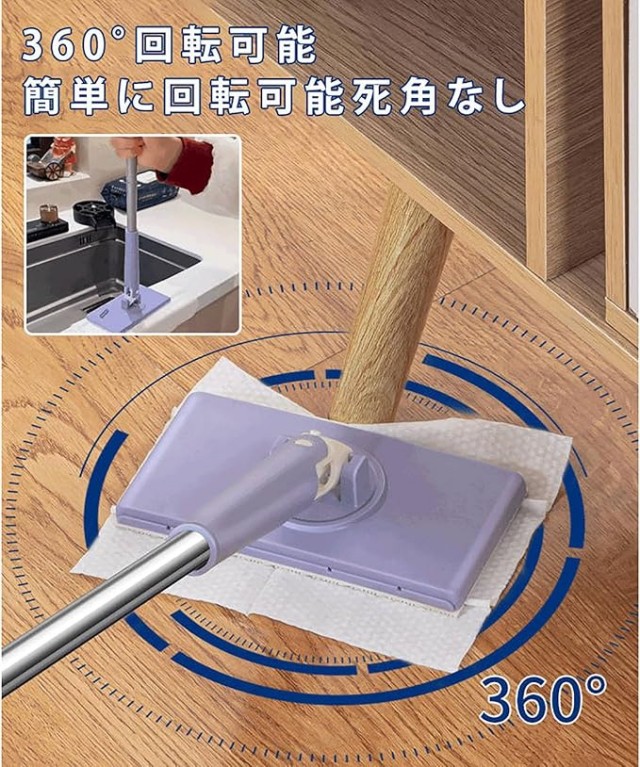 自動で雑巾を挟むモップ、手洗い不要の自動モップ、クレンジングタオルが一瞬でモップに変身、手洗い不要/自動でシートを挟む/360°回転可能。ハンドルで軽く押す、1秒だけでクロスを挟める、従来の掃除方法を変える手を汚さず/接触しない/高所に使える、軽く回転させて、隅々まで清潔に。