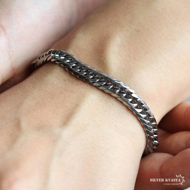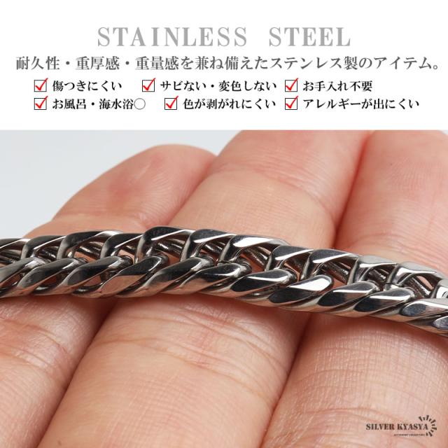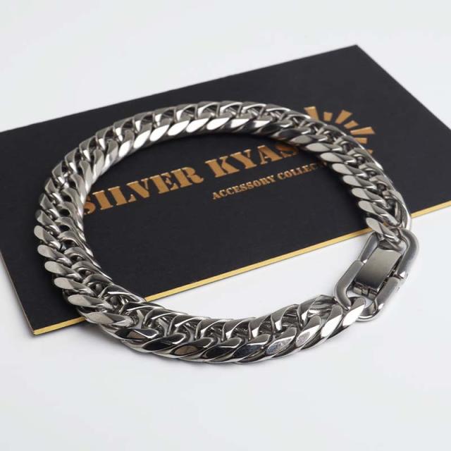 密度が濃く圧倒的な存在感が人気のダブル喜平ブレスレット。6面カットの繊細な光の反射が美しいチェーンアイテムです。ステンレス製なのでつけっぱなしでも問題ございません。チェーンの長さは全2サイズからお選びいただけます。