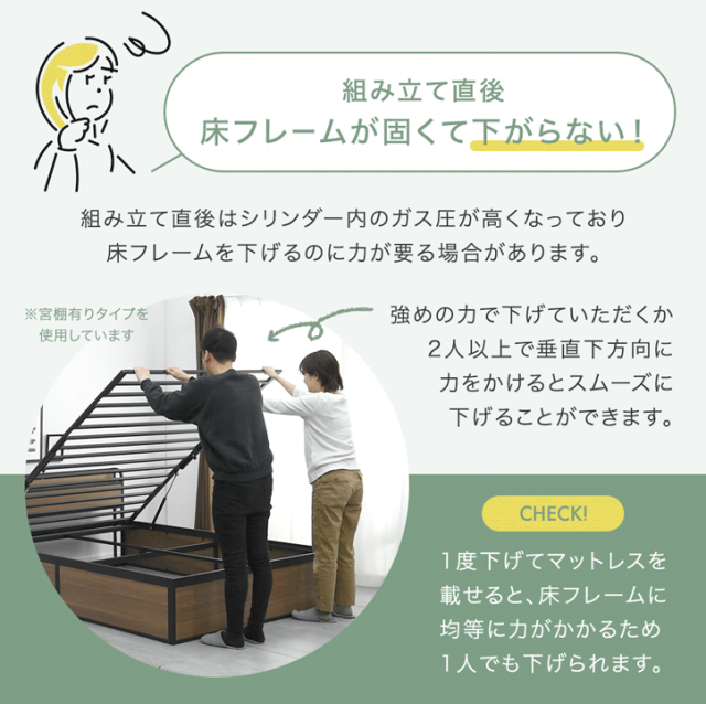 ※組み立て直後はシリンダー内のガス圧が高くなっており、床フレームを下げるのに力が要る場合があります。強めの力で下げていただくか2人以上で垂直した方向に力をかけるとスムーズに下げることができます。