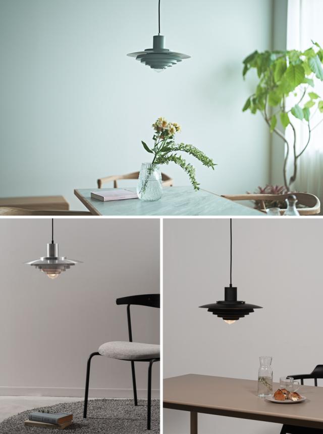 重なったシェードから美しい灯りが広がるペンダントライトです。アルミ素材の無骨な質感と遊び心のあるデザインがお部屋に彩りを与え、消灯時もインテリアとして存在感を放ちます。