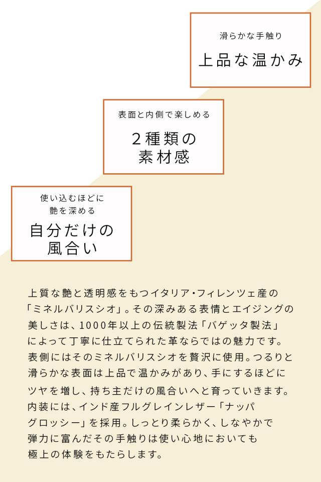 | 上質な艶と透明感をもつイタリア・フイレンツェ産の「ミネルバリスシオ」。その深みある表情とエイジングの美しさは、1000年以上の伝統製法「バケッタ製法」によって丁寧に仕立てられた革ならではの魅力です。表革には、そのミネルバリスシオを贅沢に使用。つるりと滑らかな表面は上品で温かみがあり、手にするほどに艶を増し、持ち主だけの風合いへと育っていきます。内装には、インド産フルグレインレザー「ナッパグロッシー」を採用。しっとりと柔らかく、しなやかで弾力に富んだその手触りは、使い心地においても極上の体験をもたらします。滑らかさと本物の質感を意味する「リスヴェロ」は、使うたびに輝きを深めていく、大人のためのレザーウォレットシリーズです。 |