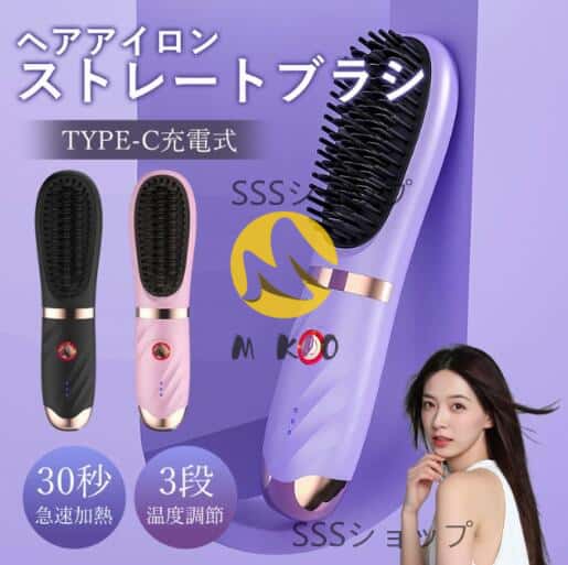 ヘアアイロン ストレートアイロン ヘアアイロンブラシ コードレス ヒートブラシ USB充電式 携帯用 ブラシ 3段階温度調整 急速