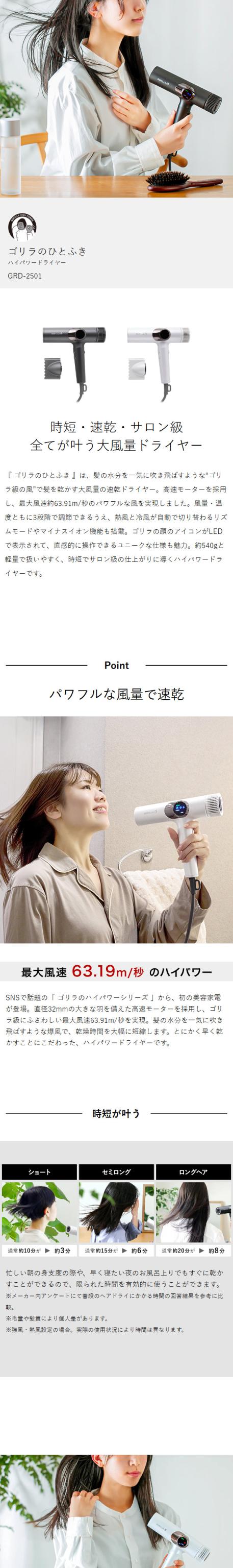 [ ゴリラシリーズ ゴリラのひとふき ]ゴリラ ドライヤー 速乾 大風量 時短 冷熱風 マイナスイオン 強力 高速ドライヤー 早く乾く 温風 冷風 ヘアドライヤー コンパクト 軽量 美容家電 美髪 最強 ヘアサロン プレゼント ギフト GRD-2501