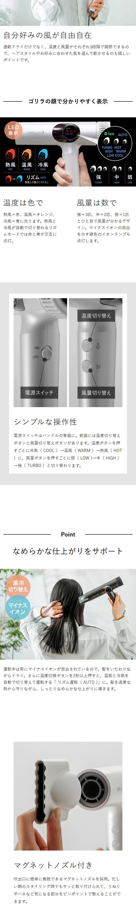 時短・速乾・サロン級 全てが叶う大風量ドライヤー 『 ゴリラのひとふき 』は、髪の水分を一気に吹き飛ばすような“ゴリラ級の風”で髪を乾かす大風量の速乾ドライヤー。高速モーターを採用し、最大風速約63.91m/秒のパワフルな風を実現しました。風量・温度ともに3段階で調節できるうえ、熱風と冷風が自動で切り替わるリズムモードやマイナスイオン機能も搭載。ゴリラの顔のアイコンがLEDで表示されて、直感的に操作できるユニークな仕様も魅力。約540gと軽量で扱いやすく、時短でサロン級の仕上がりに導くハイパワードライヤーです。