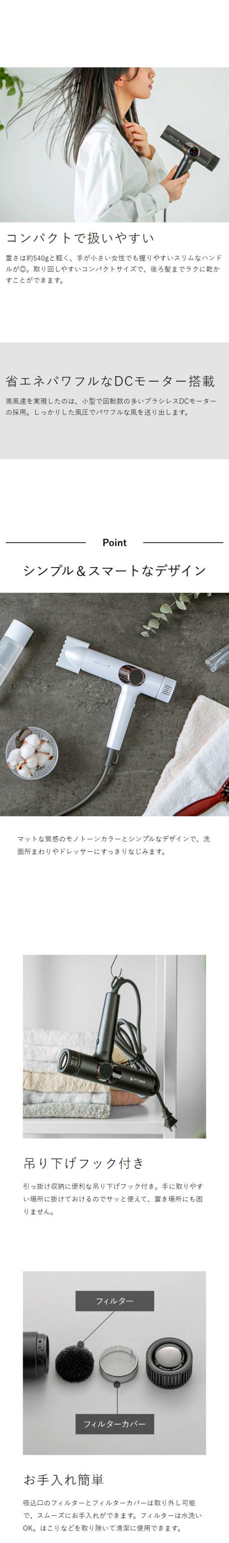 ゴリラ級の風を生み出すコンパクトで大風量な速乾ドライヤー。風量・温度は3段階で調節でき、温冷自動切換えのリズムモードで美髪ケア。マイナスイオン機能搭載で優しく髪を乾かせる◎。