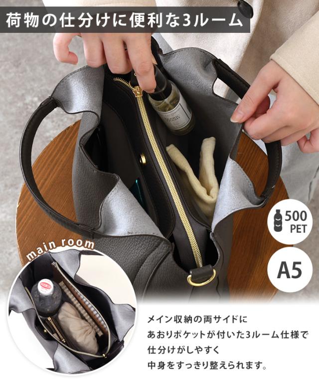 小ぶりながらマチが広く、A5サイズや横向きに500mlペットボトルが収納できるサイズ感