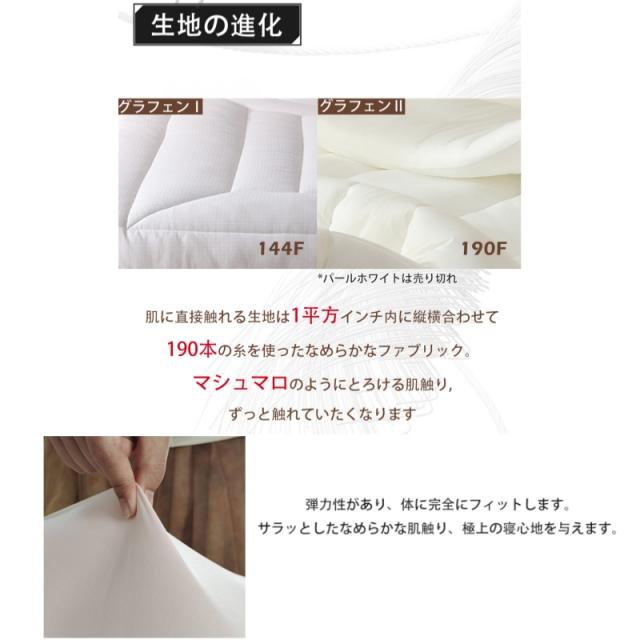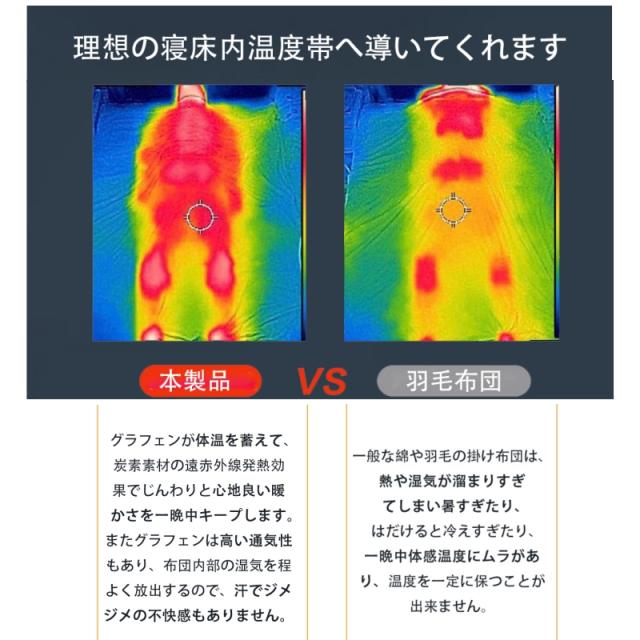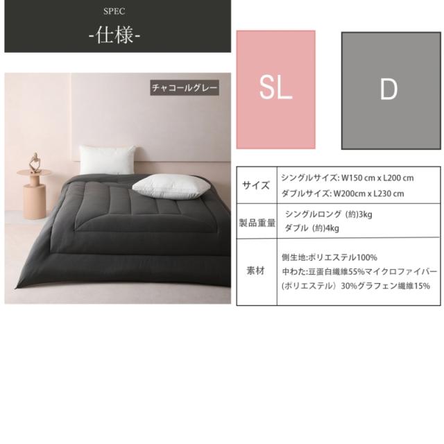・重量:約3kg 【ダブル】: W200 cm x L230 cm 側生地:ポリエステル100% 中わた:豆蛋白繊維55% マイクロファイバー(ポリエステル) 30% グラフェン繊維15% 液温は30℃を限度として、洗濯機で弱い洗濯できる(ネット使用) お洗濯後、十分に干してからお使い下さい。 ※洗濯機の容量をお確かめください。容量によっては、業者洗濯や大型ランドリーでのお洗濯をオススメします。 ※タンブル乾燥はできない ※漂白処理はできない style="background-color:#333333;color:#ffffff;padding:5px;margin-top:15px;">商品画像