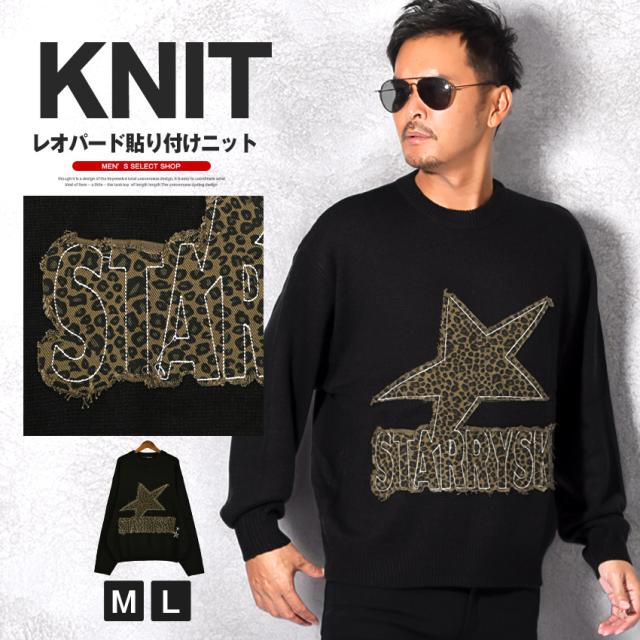 ニット セーター メンズ レオパード ヒョウ柄 豹柄 星 スター ロゴ 貼り付け おしゃれ 古着系 黒【レオパード貼り付けニット】 aa-3799