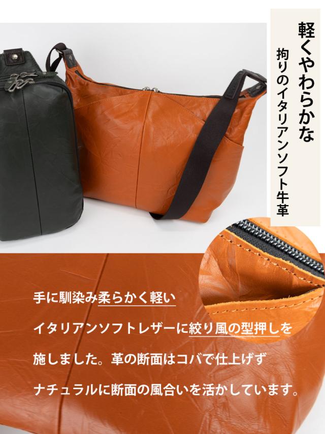 手に馴染み軽くて柔らかいイタリアンソフトレザーに絞り風の型押しを施したおしゃれなレザーバッグです。革の断面はコバで仕上げずナチュラルでカジュアル仕上がっています。