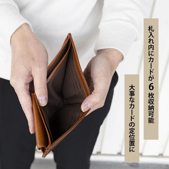 ベーシックな2つ折りのスタイルです。見開きには4枚のカードしか入りませんが、札入れ内にカードポケットが6つついています。背面にはICカード収納に便利なポケットが付いています。