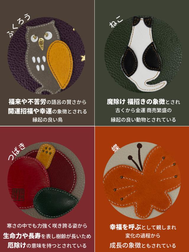 ■色:4色(ねこ(グリーン)・ふくろう(パープル)・蝶(ライトベージュ)・つばき(ベージュ))