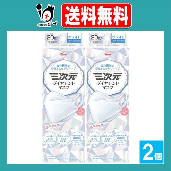 三次元ダイヤモンドマスク ホワイト フリーサイズ 20枚入×2個セット【Kowa 興和】立体形状で空間をしっかりキープ 口元ゆったり 長時間快適 耳が痛くないふんわり耳ひも 不織布マスク 三次元マスク 個別包装 4層構造