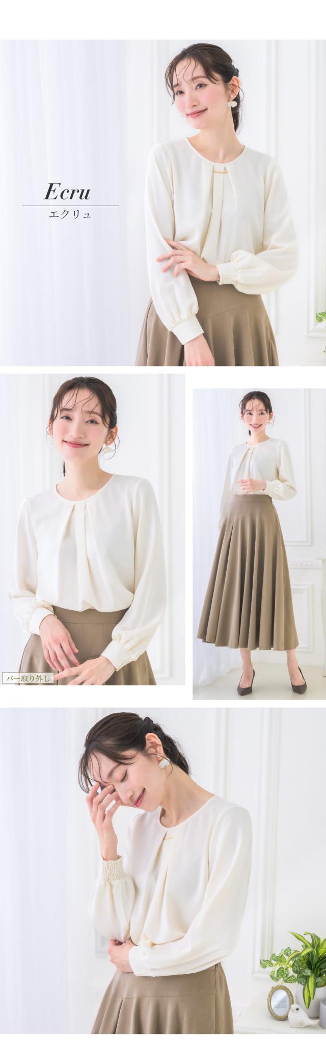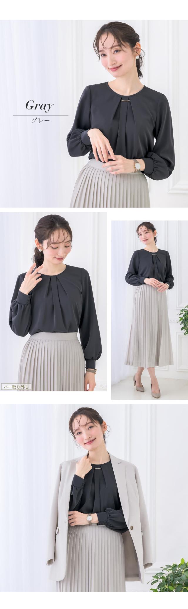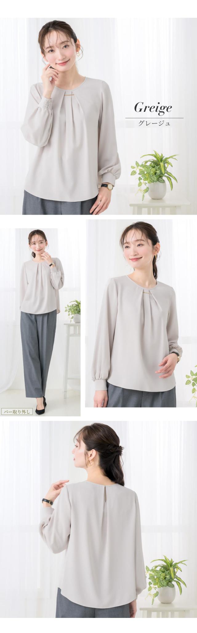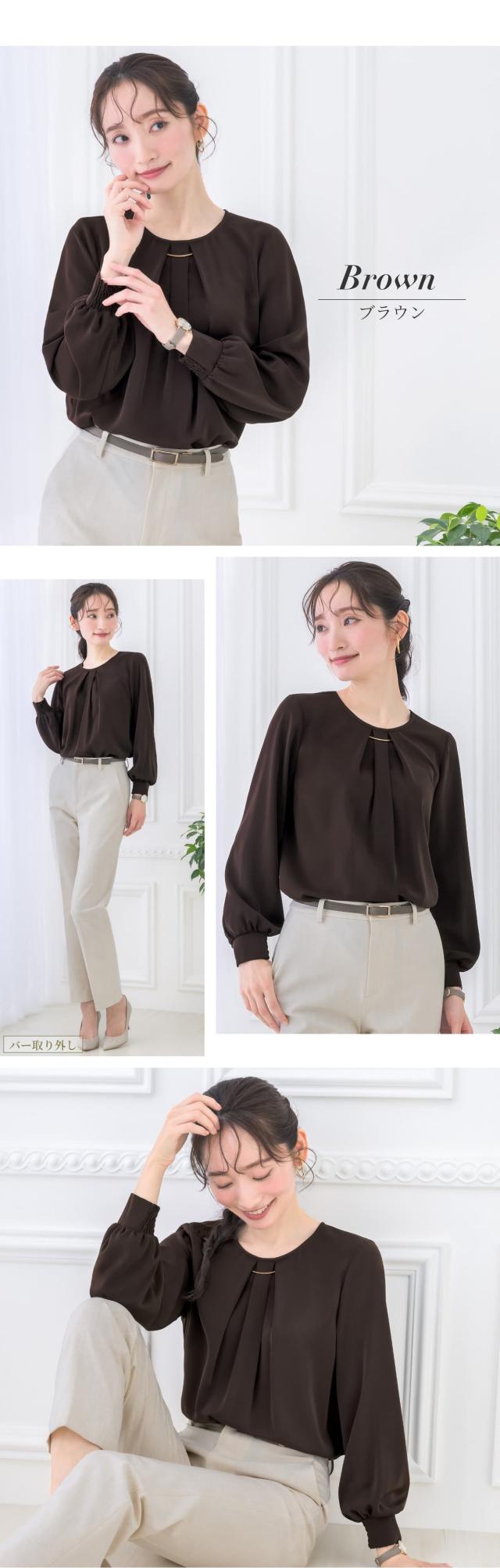 | さりげないディテールにこだわった、バー付きシャーリング袖ブラウス。 胸元のバーは、取り外し用の金具が表から見えない仕様で、着こなしに合わせて表情を変えられる2wayデザインです。 お洗濯の際も安心してお手入れいただけます。 袖口の内側半分にはシャーリングを施し、折り返さずとも腕をすっと上げやすい設計に。 家事やデスクワークなどの日常動作も妨げにくく、軽やかで快適な着心地を叶えます。 背面にはタックを入れることで、ほどよいゆとりと自然な立体感をプラス。 動きやすく、後ろ姿まできれいに見せてくれます。 涙あき仕様で着脱をサポート。表からボタンが見えないすっきりとした印象です。 生地はさらっとした柔らかい肌触り。 ロングシーズン着まわせて、シワになりにくい優秀素材です。 程よいハリがありながら毛玉になりにくく、キレイ見えする生地のため扱いやすいところも魅力的。 落ち着きのある大人カラーは、通勤スタイルからきちんと感のあるフォーマルシーンまで幅広く活躍。 上品さと実用性を兼ね備え、日常に自然と馴染みながら装いを美しく整えてくれる、頼れるブラウスです。 | |