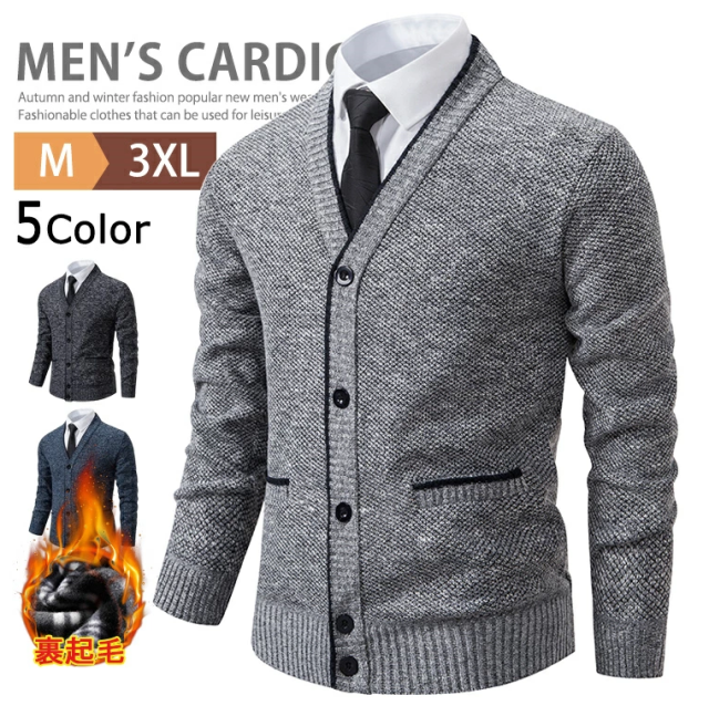 【ビジネスシーンもカジュアルにも映える一着!メンズ Vネック カーディガン 厚手 裏起毛 ニットジャケット】