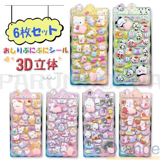6枚セット おしりぷにぷにシール キャラクター 3D 立体シール おしりシール もちもち かわいい ぷっくり 動物 ぷくぷく 女の子 シール帳 おしり シール