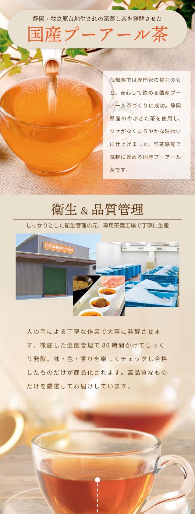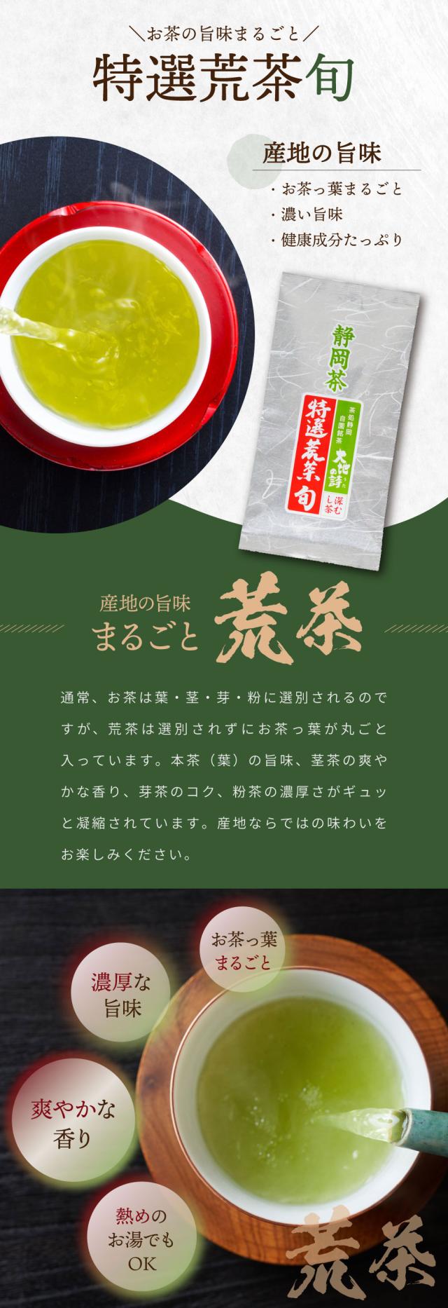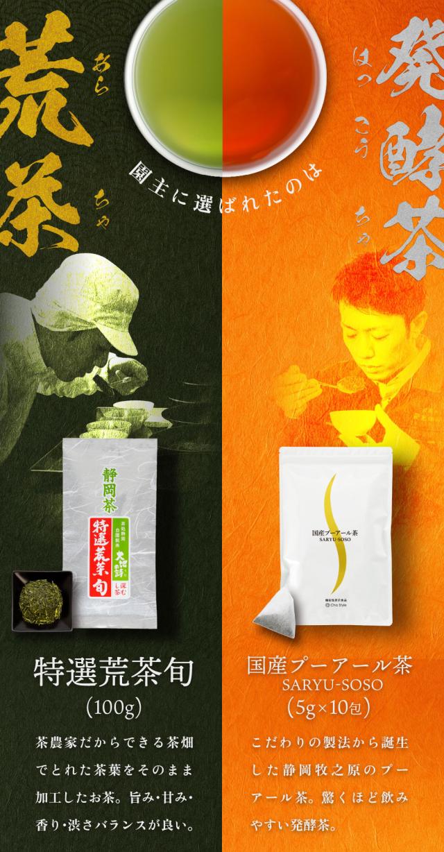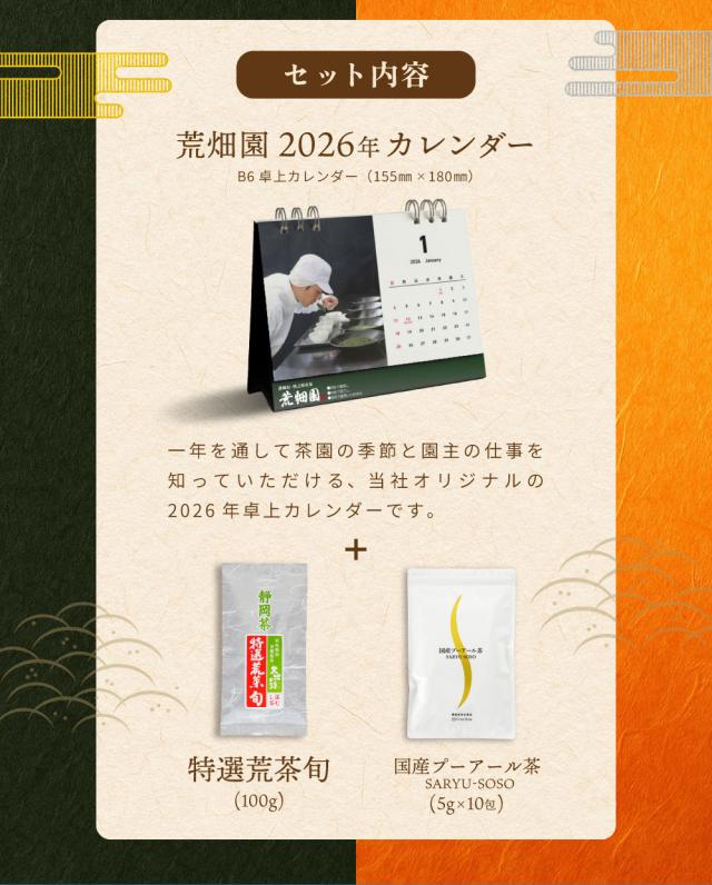 【内容量】特選荒茶旬×1袋、国産プーアール茶×1袋、カレンダー×1個