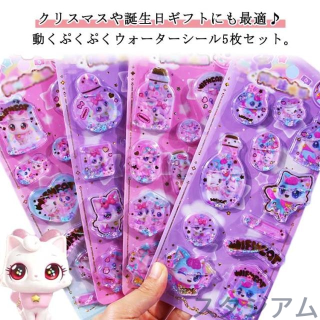 | 動くぷくぷくウォーターシール5枚セット。 クリスマスや誕生日ギフトにも最適♪ 中に水とスパンコール・ビーズが入っていて、ゆらすとキラキラ動くのがとっても楽しい♪ ぷっくり立体のぷにぷにシールだから、手帳やノートが一気にかわいく変身しちゃうよ。 スマホケース飾り、手帳、日記帳、文具デコレーションなど、多彩なDIY用途にご利用いただけます。 小学生・女の子へのプレゼントにも!手作り好きさんやコレクターにも人気のアイテムです。 【使い方いろいろ!】 シール帳をかわいくデコ! ノートや手帳にペタッ♪ スマホケースやアルバムにキラキラポイント。 ごほうびシールとしても大人気! | |