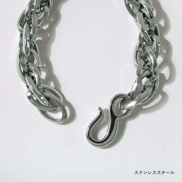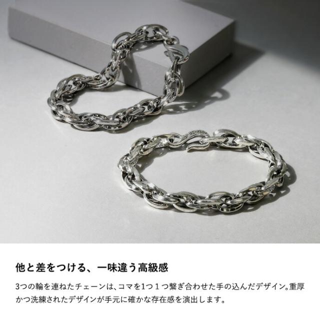 3つの輪を連ねたチェーンは、コマを1つ1つ繋ぎ合わせた手の込んだデザイン。重厚かつ洗練されたデザインが手元に確かな存在感を演出します。高級感のある輝きでコーデを格上げできるブレスレットです。