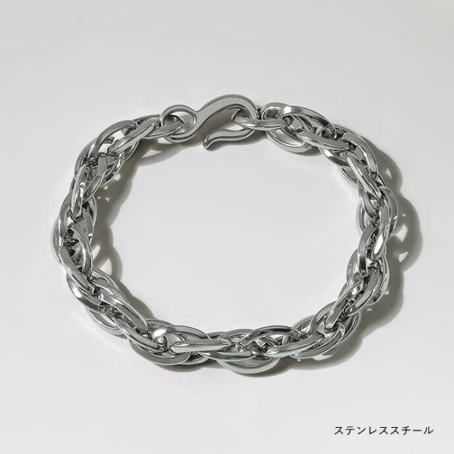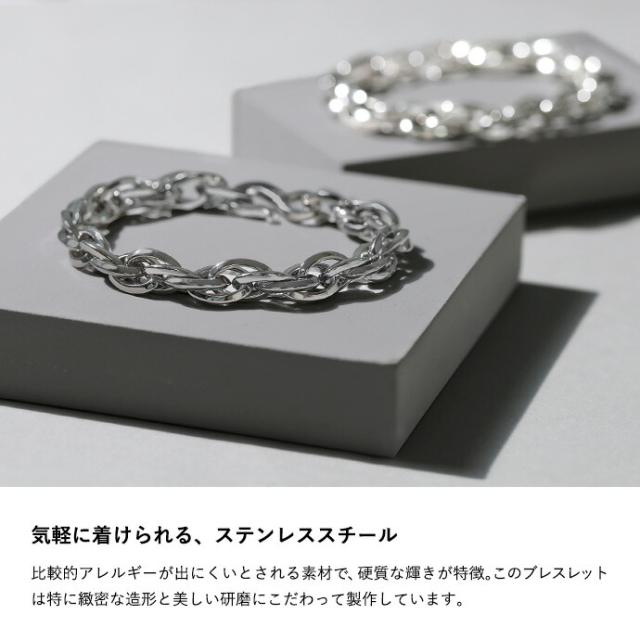 ステンレススチールは比較的アレルギーが出にくいとされる素材で、硬質な輝きが特徴。このブレスレットは特に緻密な造形と美しい研磨にこだわって製作しています。