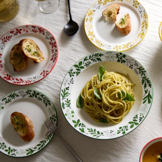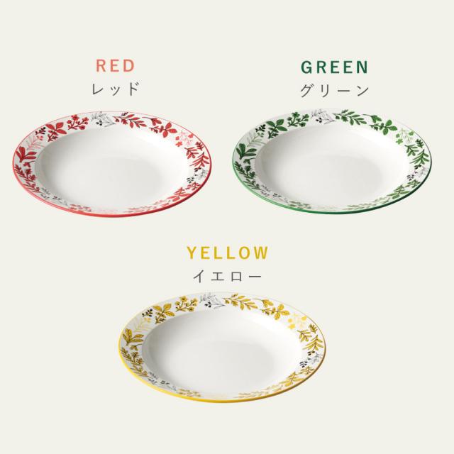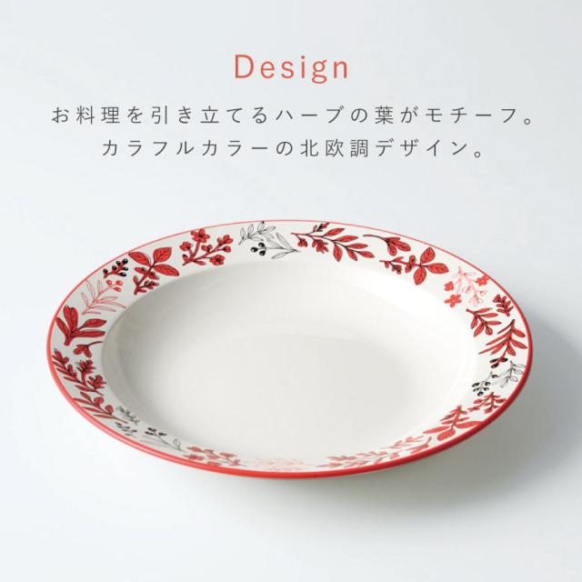 お料理を引き立てるハーブの葉をモチーフにした、カラフルカラーがアクセントの北欧調の深皿。さりげなく香り立つようなデザインが、暮らしに優しく寄り添います。