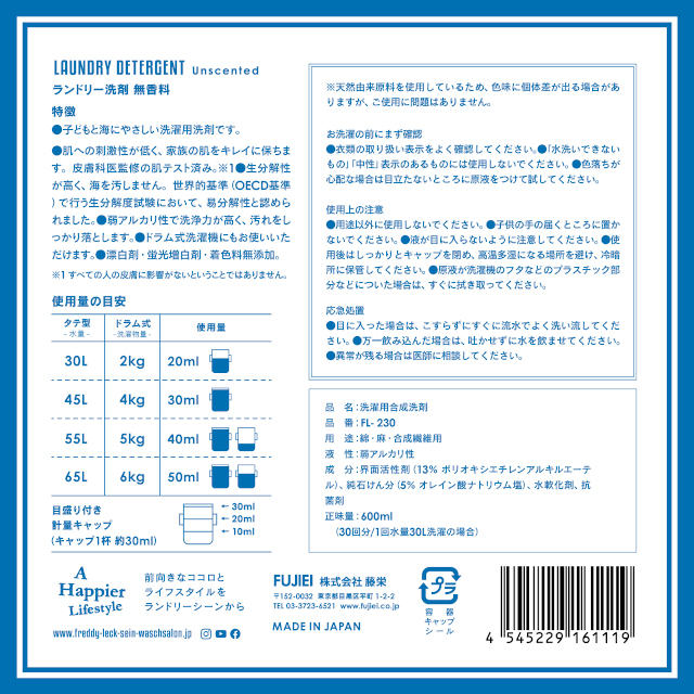 FREDDY LECK ランドリー洗剤 600ml 無香料 FL-230【フレディレック 洗濯用洗剤 洗濯洗剤 ランドリー洗剤 弱アルカリ性 大人 子供 赤ちゃん バレンタイン ホワイトデー 母の日 父の日 クリスマス xmas 藤栄 FUJIEI】
