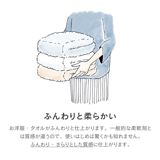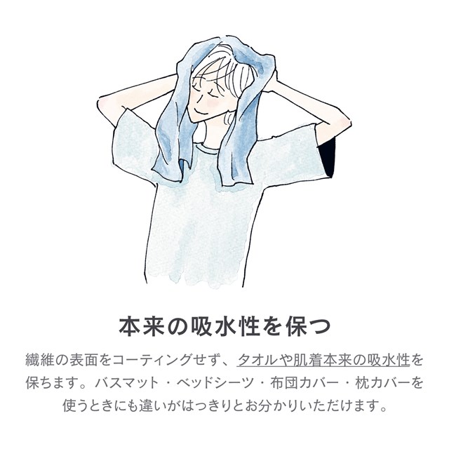 植物由来の特殊な柔軟成分を採用しているため、衣類をコーティングせずタオルや肌着の吸水性を損ないません。