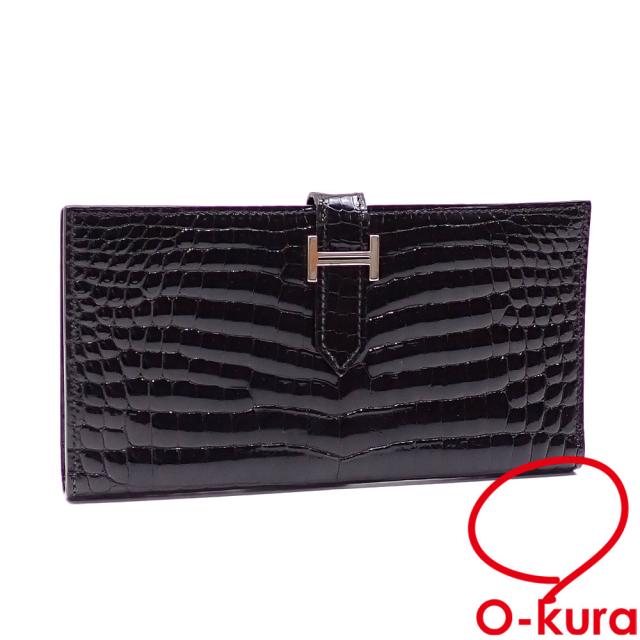 中古 エルメス ベアン 二つ折り 長財布 レディース ブラック 黒 ニロティカス □H刻印 2004年頃製 HERMES ワニ