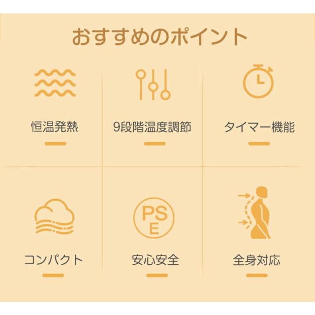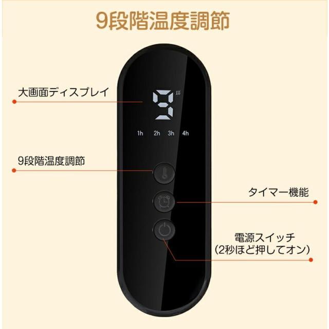 タイマー機能:長時間のつけっぱなしを防止し、切り忘れの心配を減らすことができ、高齢者の方にも安心です。電気代の節約にもなります。