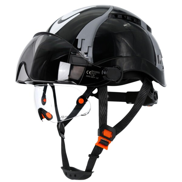 PerldVerge 安全ヘルメット 建設用 二重保護ゴーグル(サングラス+収納式透明) 通気性 調整可能 耐衝撃 ブラックヘルメット 工事用 おしゃれ X型グレーアクセント EN397準拠