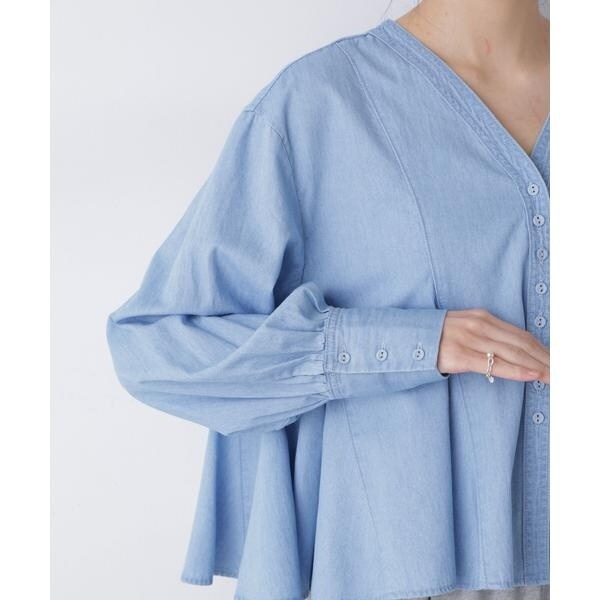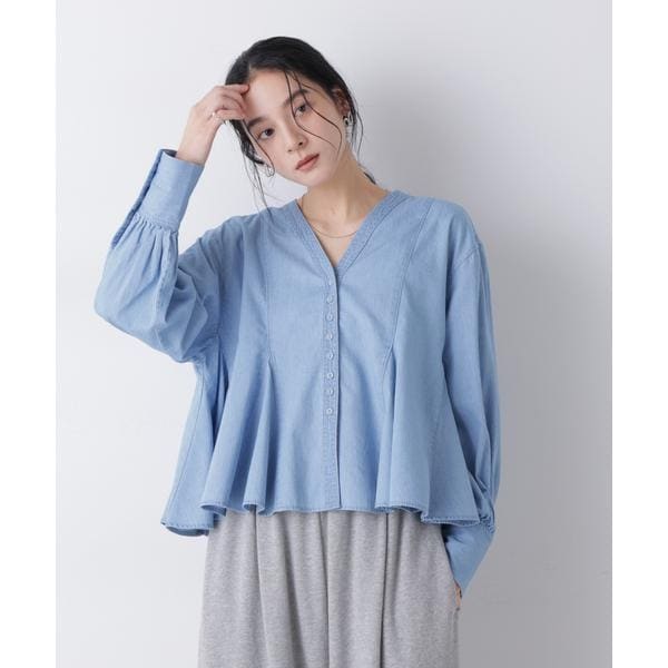 レイヤードを楽しめるVネック前開き仕様のデニムブラウス。ウエスト位置から広がるペプラムシルエットがすっきりとした印象に導き、さりげなくスタイルアップ効果を発揮してくれるアイテムです。