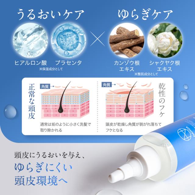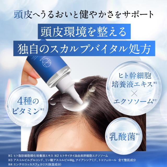 年齢や乾燥で乱れがちな頭皮環境を、内側*1から整える頭皮の美容液!エクソソーム*2やヒト幹細胞培養液エキス*3を配合したローションが乾燥が気になる頭皮にダイレクトに浸透*1アプローチ。 *1角質層まで *2ヒトサイタイ血由来幹細胞エクソソーム *3ヒト脂肪細胞順化培養液エキス「頭皮の乾燥やフケ、かゆみが気になる…」そんなあなたのために、皮膚科学に基づいて研究開発した頭皮用ローションです。