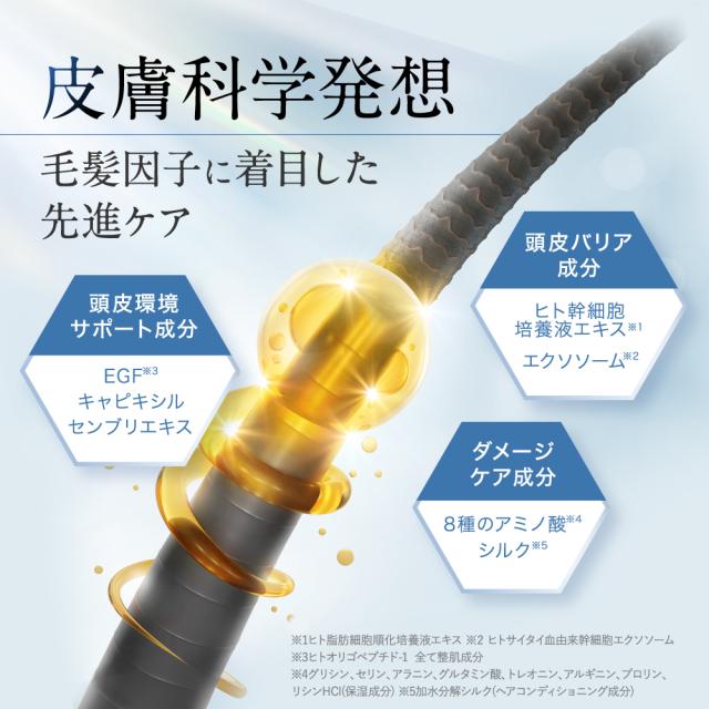 毛髪因子に着目し、サイクルサポート成分・頭皮バリア成分・ダメージケア成分を配合。髪と頭皮の悩みにトータルアプローチ。