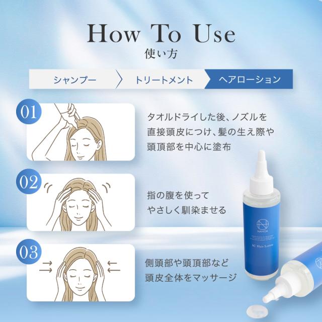 ノズルをひねって塗布するだけの簡単ケア! ?タオルドライした後、ノズルを直接頭皮につけ、髪の生え際や頭頂部を中心に塗布。?指の腹を使って やさしく馴染ませる。?側頭部や頭頂部など頭皮全体をマッサージ。